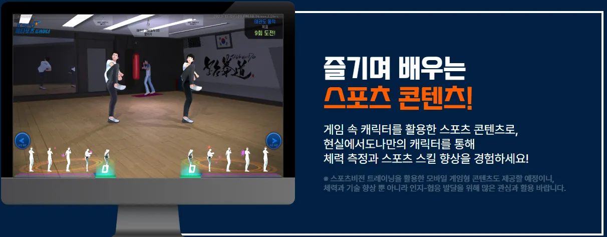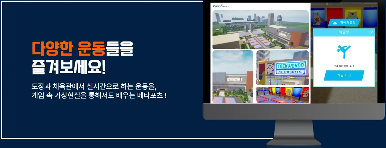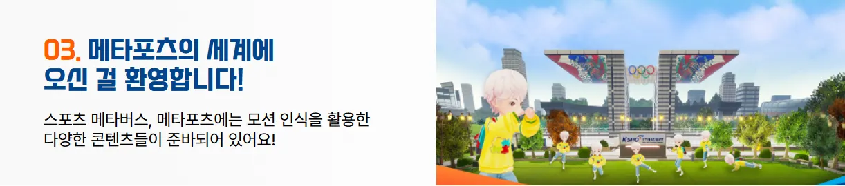 'KSPO메타포츠'는 문화체육관광부, 국민체육진흥공단의 지원으로 개발된 스포츠 메타버스 아카이빙 콘텐츠 플랫폼이며, 국민체육진흥공단 한국스포츠정책과학원, ㈜미디어그룹사람과숲, ㈜유티플러스인터랙티브가 개발에 참여한 사업입니다. ( 2024년)